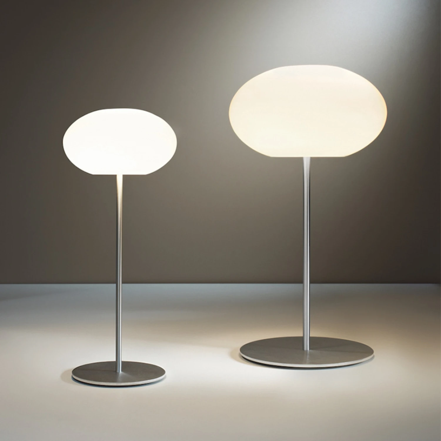La lampe de table Aih promet une élégance pure et une combinabilité polyvalente. La caractéristique de la série est l’ombre sous forme d’un ellipsoïde de rotation horizontale, qui est un produit de l’art traditionnel du soufflage du verre. Sur une table de salon, un buffet, une table de restaurant ou un comptoir de réception dans un hôtel, Aih convainc par sa lumière non éblouissante. Une ouverture sur la face inférieure met en valeur la base ronde et le cadre en forme de tige en aluminium brossé à lumière directe.