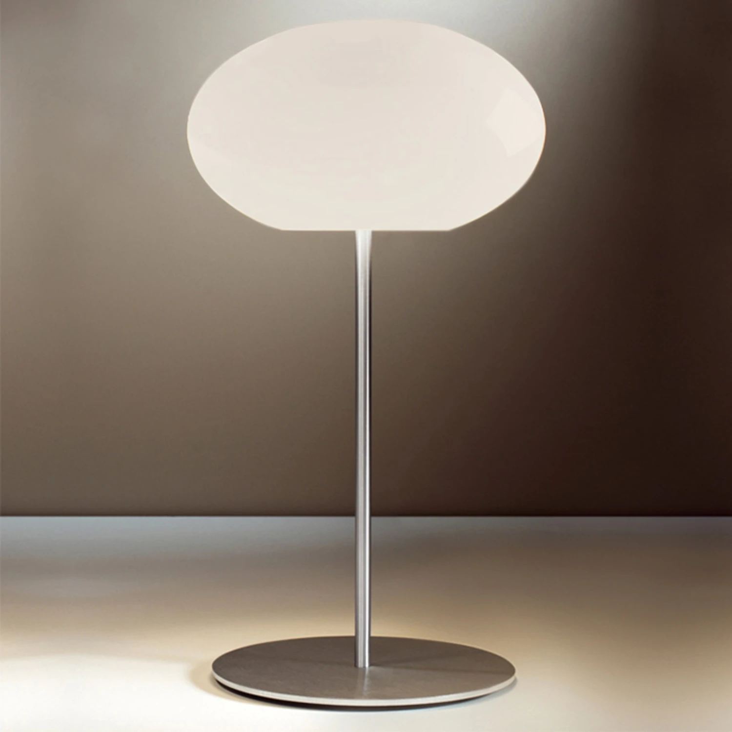 La lampe de table Aih promet une élégance pure et une combinabilité polyvalente. La caractéristique de la série est l’ombre sous forme d’un ellipsoïde de rotation horizontale, qui est un produit de l’art traditionnel du soufflage du verre. Sur une table de salon, un buffet, une table de restaurant ou un comptoir de réception dans un hôtel, Aih convainc par sa lumière non éblouissante. Une ouverture sur la face inférieure met en valeur la base ronde et le cadre en forme de tige en aluminium brossé à lumière directe.