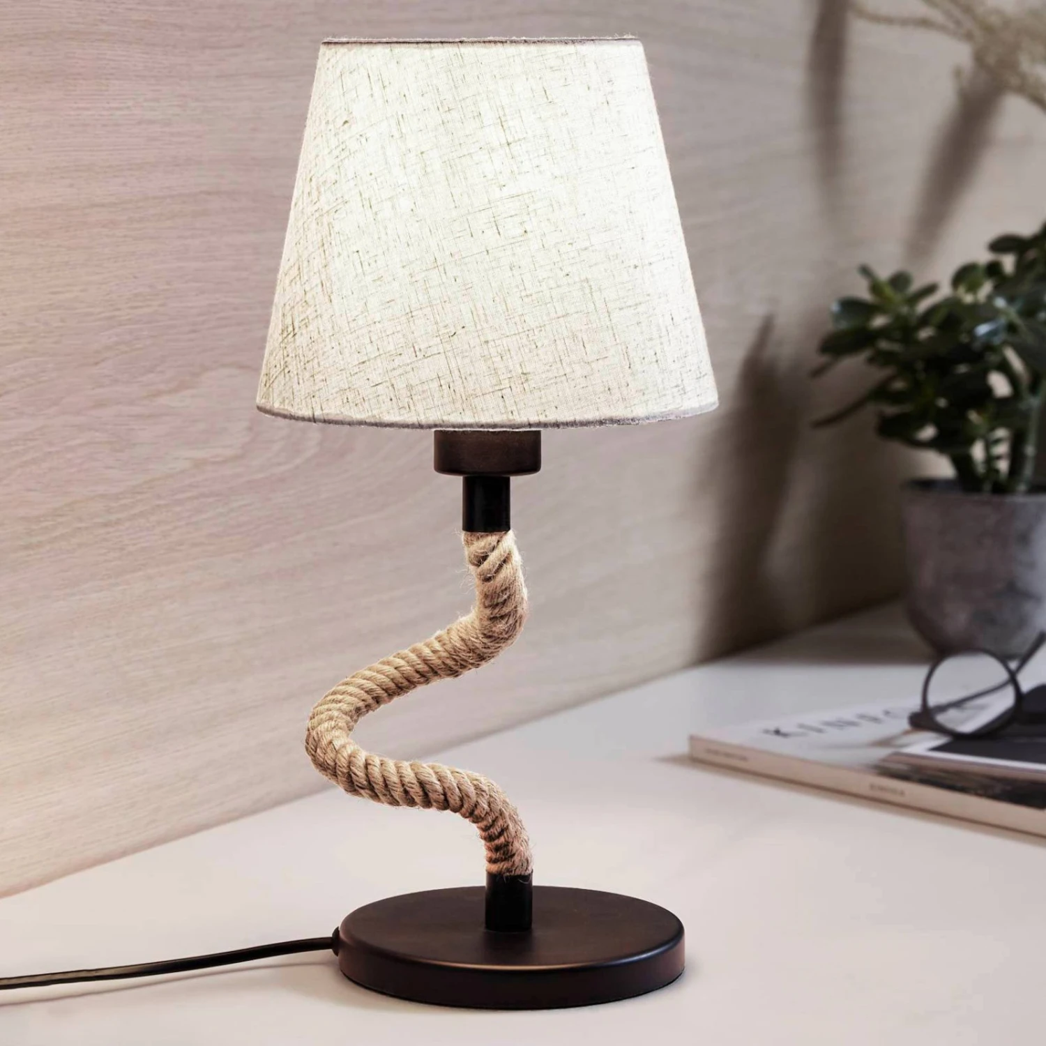 La teinte textile crème du luminaire complète harmonieusement la corde qui, une fois courbée et drapée, sert de support. La base de la lampe est en acier noir et complète harmonieusement le design en trois parties. Le mélange des matériaux et la lumière douce créent une atmosphère particulièrement chaleureuse.