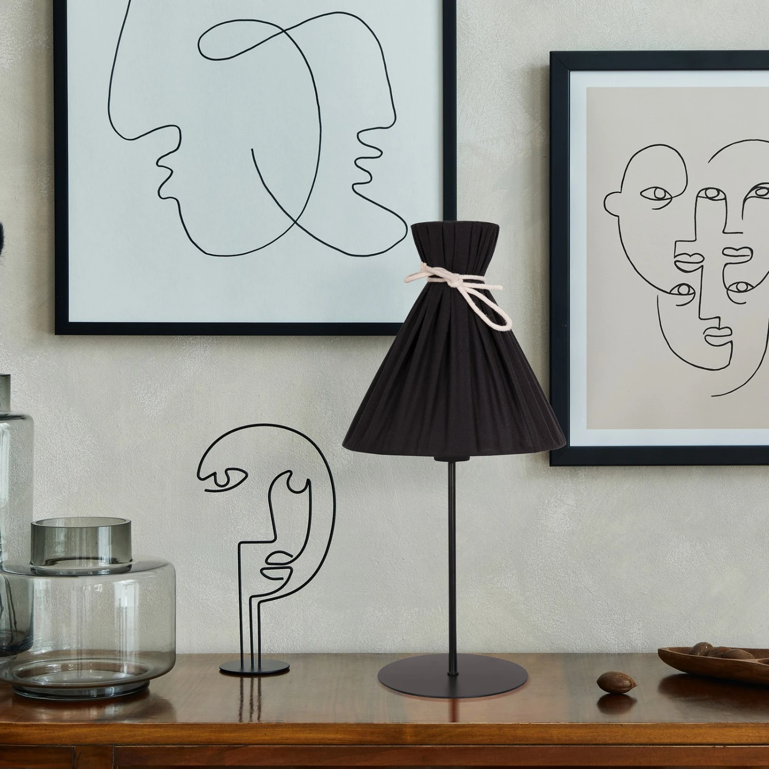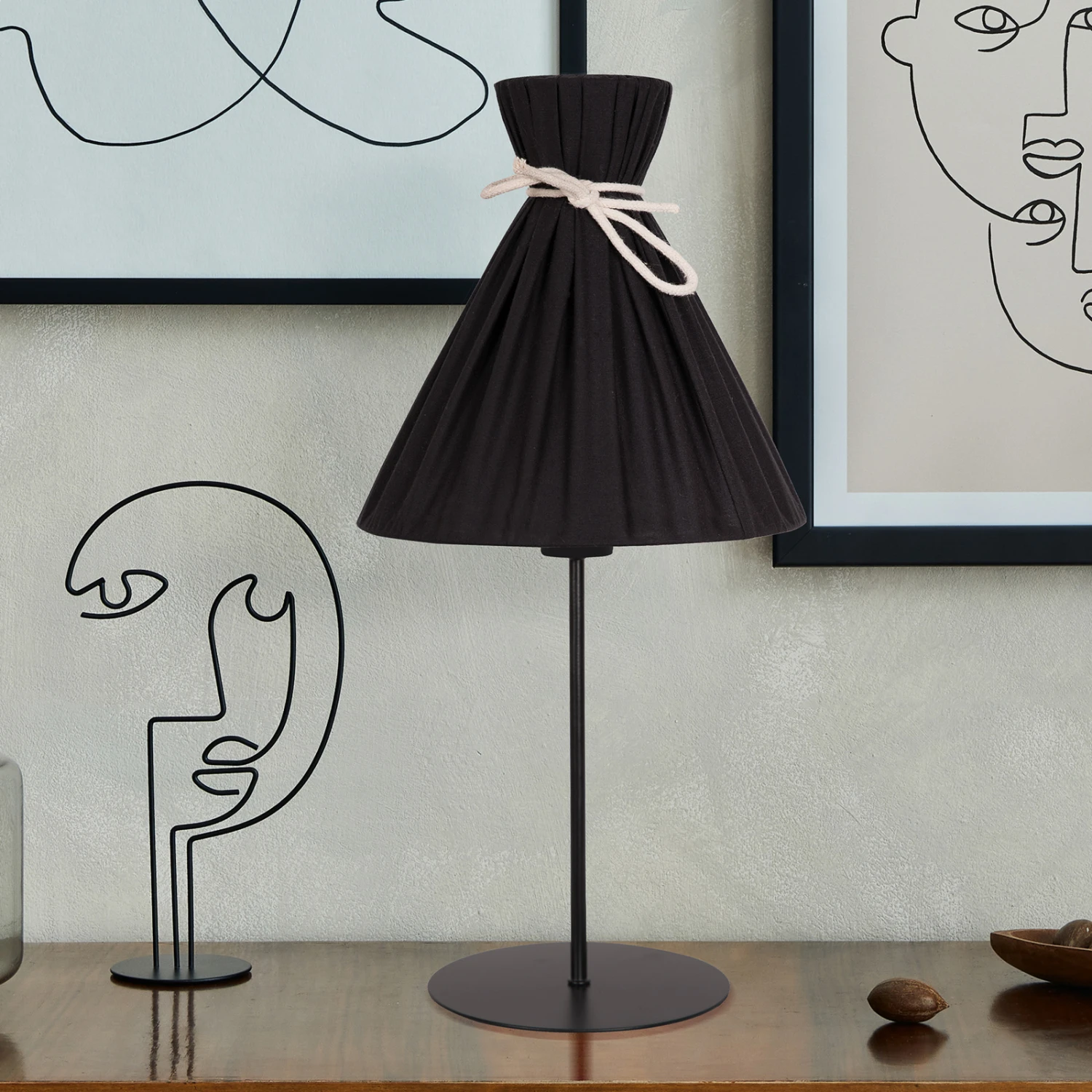 Lampe à poser Lola noire avec abat-jour conique en tissu de coton