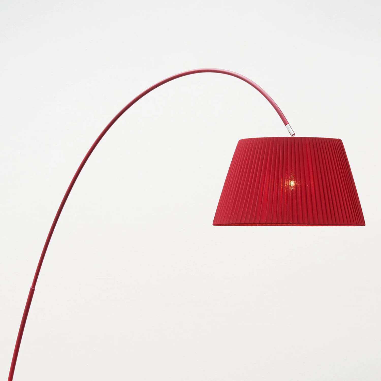 Lampadaire arqué rouge Marion – saillie 160 cmLe lampadaire arqué Marion, entièrement rouge, est l’un des points forts de l’éclairage moderne : Le large abat-jour en textile est réalisé dans un mélange d’organza et de soie, et les plis formés par la lumière diffusée créent une ambiance particulièrement chaleureuse. Un lampadaire qui, placé à côté du canapé par exemple, fournit un éclairage d’appoint confortable dans une grande zone.