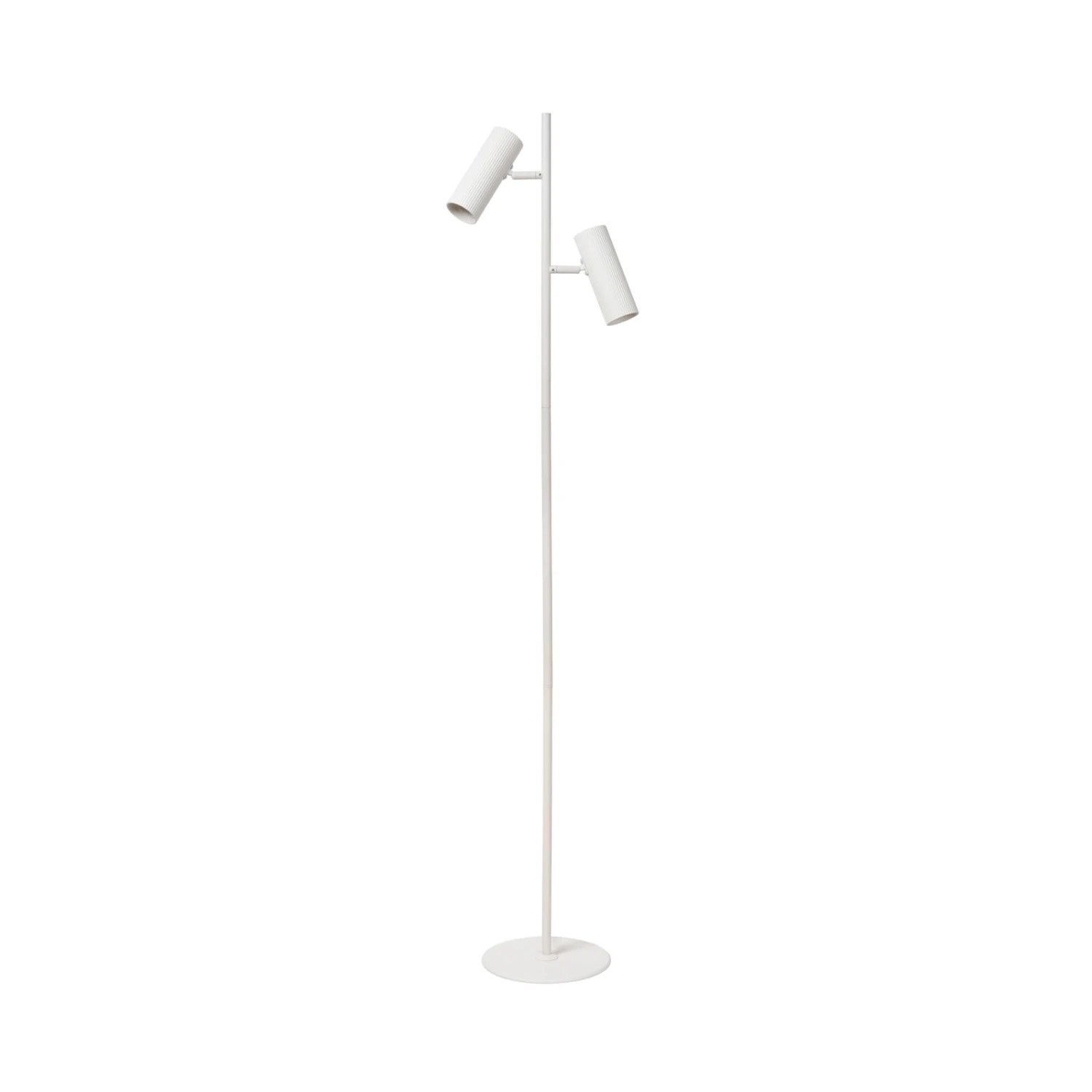 Lampadaire à deux flammes Clubs en blancLe lampadaire Clubs se distingue par sa structure gracile et ses détails discrets. Le luminaire est en aluminium et entièrement blanc. Seuls les deux spots cylindriques, qui sont mobiles, présentent une structure rainurée qui égaye l’optique. La taille du cône de lumière directe peut être influencée par le choix de la lampe. Grâce à sa possibilité d’orientation, Clubs est idéal comme lampe de lecture.