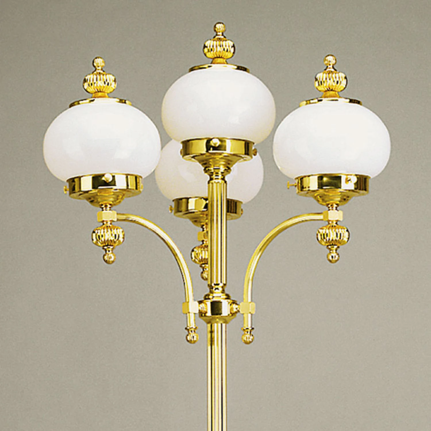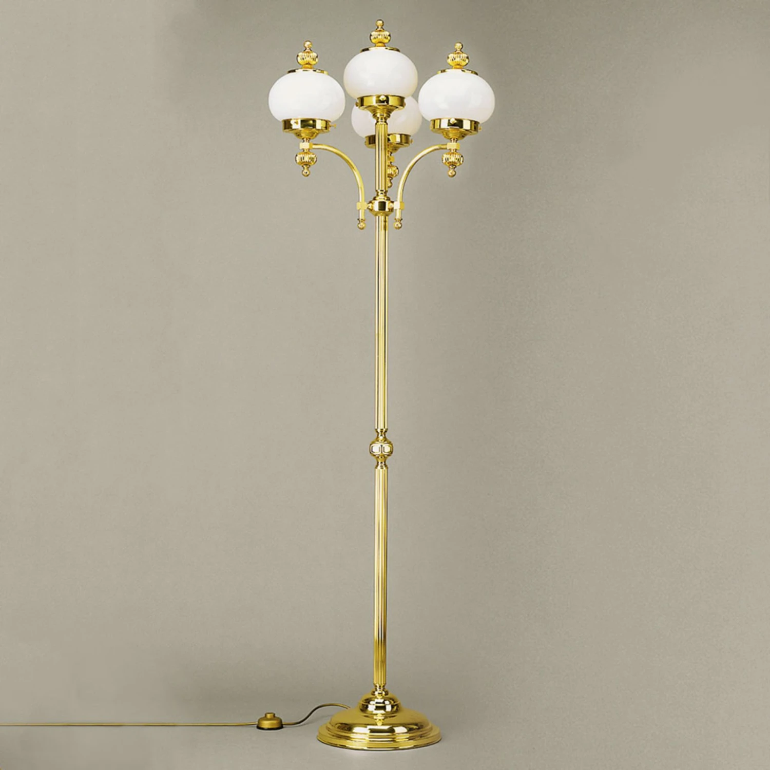 Ce lampadaire affiche une apparence très noble grâce au métal à l’aspect laiton poli combiné avec des verres bombés opale-mat. La particularité de ce lampadaire est sa forme exceptionnelle et ses nombreuses lampes qui rappellent la forme d’un réverbère ou d’un candélabre. Grâce à sa conception, il offre à votre salle de séjour des accents très particuliers.