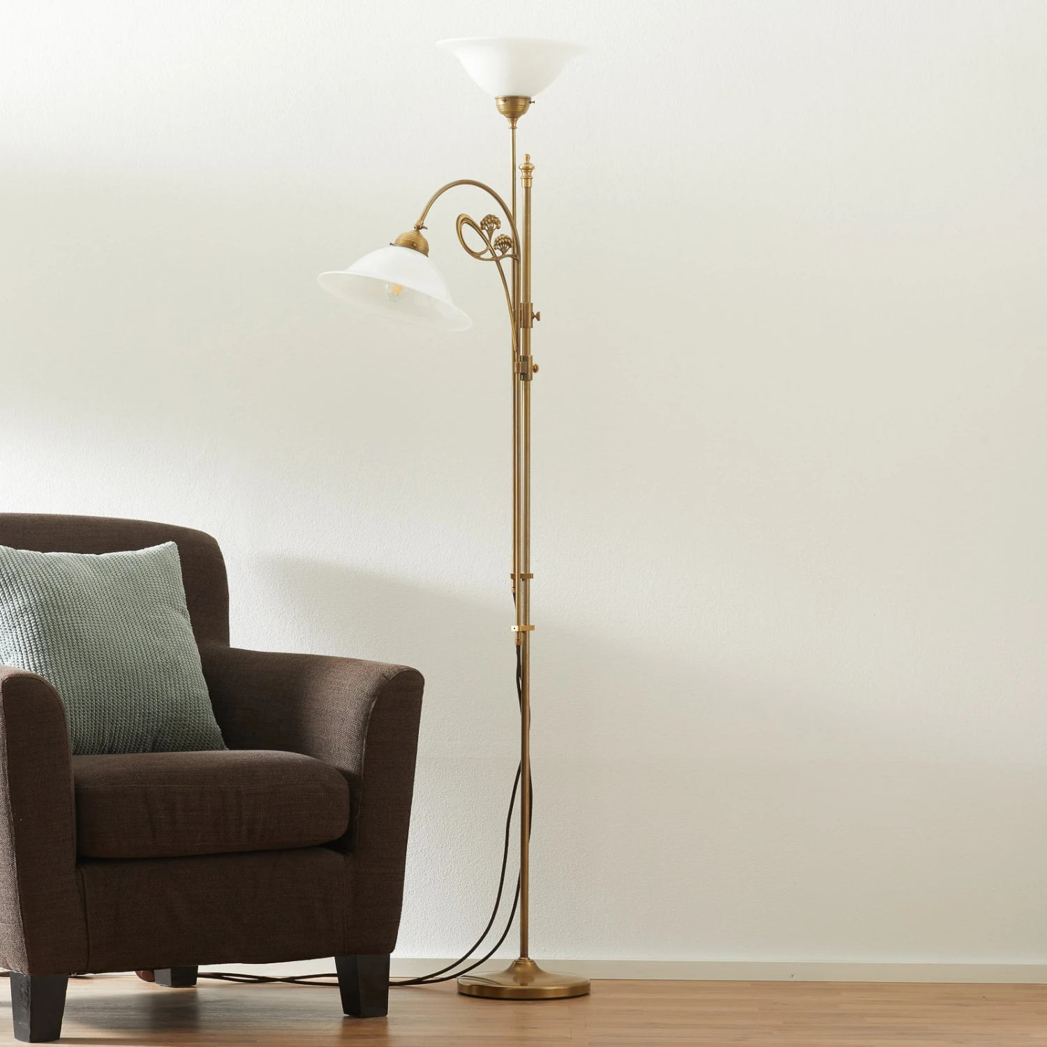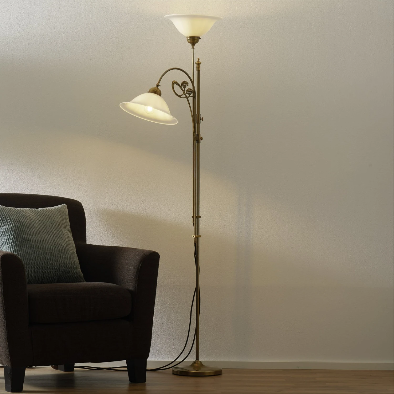 Lampadaire ALWINE Art nouveau Le lampadaire ALWINE, qui s’inspire d’anciens modèles des années 1900, est équipé d’un bras de lecture et d’un projecteur. La plupart des pièces en laiton sont assemblées à la main avec l’abat-jour en verre soufflé à la bouche. Même le câble textile d’aspect historique s’accorde avec le style. Mais bien sûr, la technique est d’aujourd’hui ! Les bras sont réglables en hauteur et sont complétés par un élément décoratif Art nouveau. La structure a été fabriquée en laiton dit de Berlin ; une patine non vernie assure une surface robuste. Le nettoyage se fait avec un chiffon doux, sans produit de nettoyage.