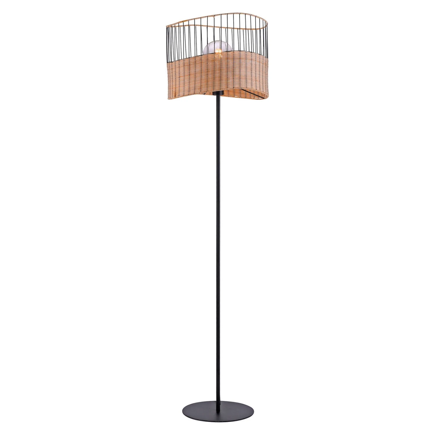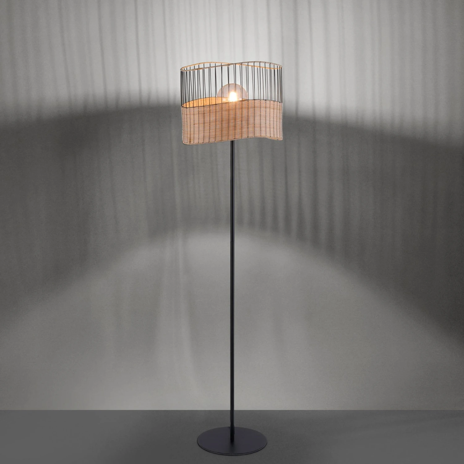 Le point fort de ce lampadaire est l’abat-jour aux belles formes. Il s’agit d’un gracieux panier en métal, dont les lignes sont élégantes et incurvées. L’aspect général rappelle la forme d’un cylindre. Le design plutôt froid et sobre du métal est harmonieusement complété par un tissage en bois. Environ la moitié de l’abat-jour du lampadaire Reed est pourvu d’un fin cannage de rotin qui part du bas. Il présente un motif subtil et offre des effets de lumière passionnants. L’illuminant est visible dans la zone supérieure et rayonne sans être atténué dans la pièce, c’est pourquoi il est recommandé d’utiliser un illuminant à filament décoatif. L’opération est très pratique grâce à un interrupteur au pied intégré.