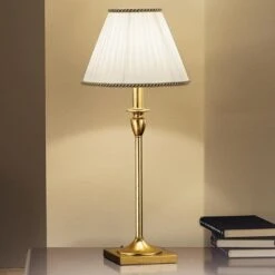 La lampe à poser Donata est disponible en deux tailles. Sa forme indémodable et son abat-jour plissé séduisent. La combinaison du textile de couleur crème et des moulures décoratives doré antique confère à la lampe à poser une beauté hors du temps. Donata est une lampe qui s’intègre parfaitement dans une ambiance raffinée. Le caractère spécial de sa surface à l’aspect antique est obtenu grâce à un travail sophistiqué du matériel.