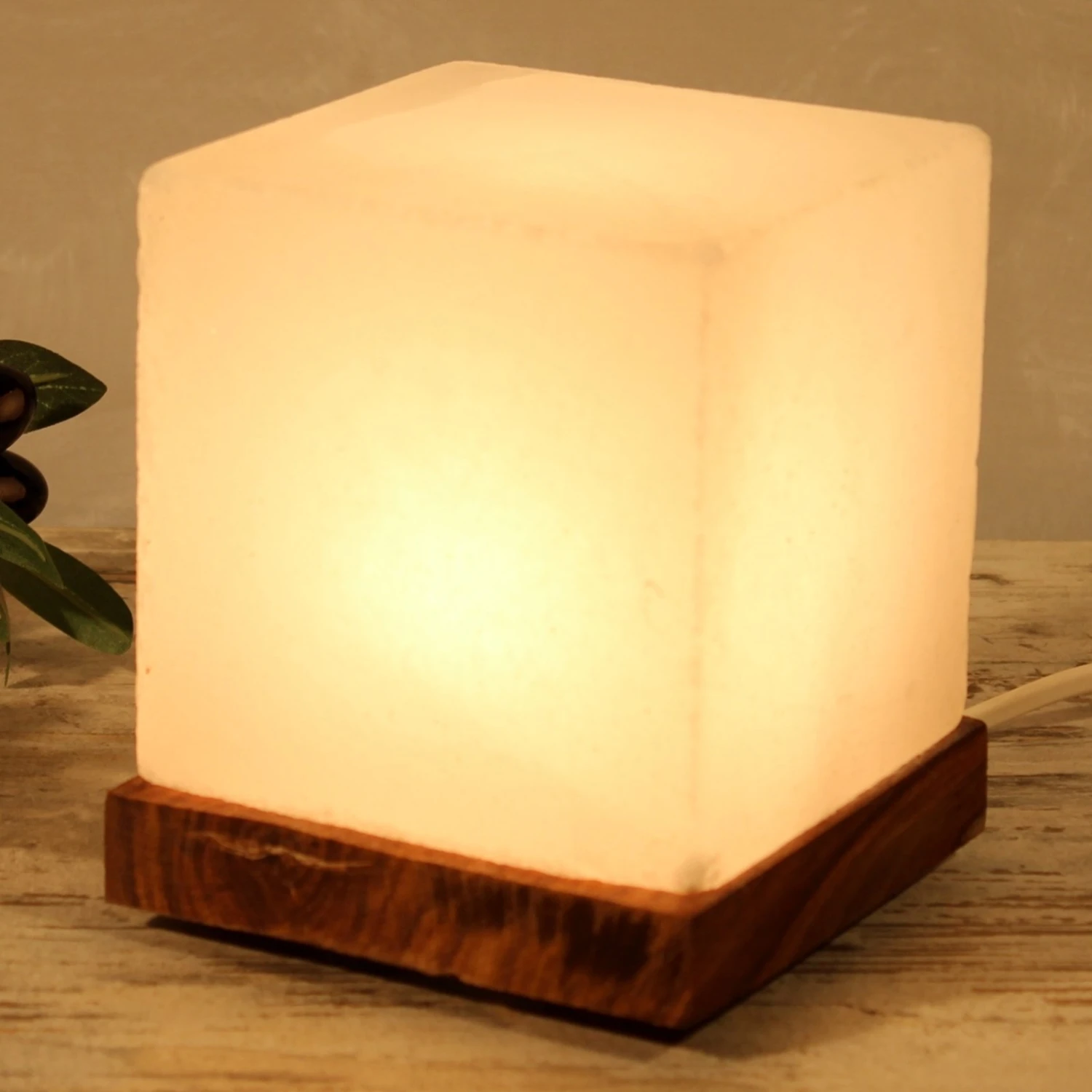 Lampe de table cubique KUBUS WHITE LINE en pierre salée et bois
