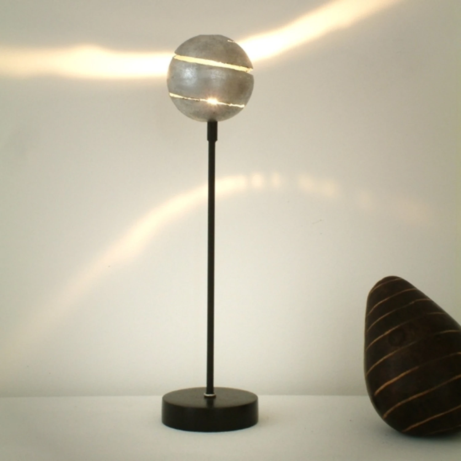 Lampe de table KUGELBLITZ SILBER pour des moments de lumière exceptionnelsLa lampe de table KUGELBLITZ SILBER a un pied noir qui maintient la boule en métal de couleur argentée. De petites fentes dans la sphère créent des effets de lumière exceptionnels. Cette lampe de table permet de créer habilement des accents brillants dans la pièce.