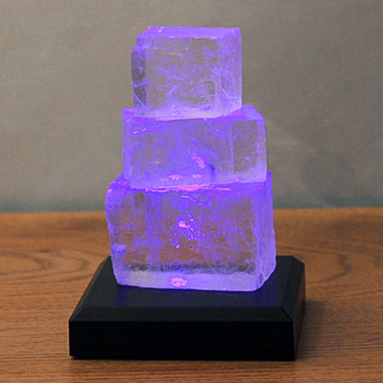 Impressionnante lampe de table Halit-Turm à la forme originale Le caractère naturel de la lampe de table est déterminé par la forme cubique originale des pierres, propre à la pierre salée. Leur clarté typique est également très bien mise en valeur avec Halit-Turm. Empilées de manière attrayante et positionnées sur une plate-forme noire, elles forment un ensemble enchanteur. La plate-forme dissimule les petites sources lumineuses colorées qui éclairent le luminaire par le bas. L’observateur peut se réjouir d’un changement de couleur plein d’ambiance et est captivé par ces effets. Ceux qui trouvent cela encore trop excitant se détendront complètement dans la douce lueur d’une seule couleur, qu’ils pourront choisir via une fonction correspondante. Halit-Turm est alimentée par des piles et offre ainsi une liberté d’aménagement sans limite, car sa taille permet à la lampe de table de trouver sa place partout.