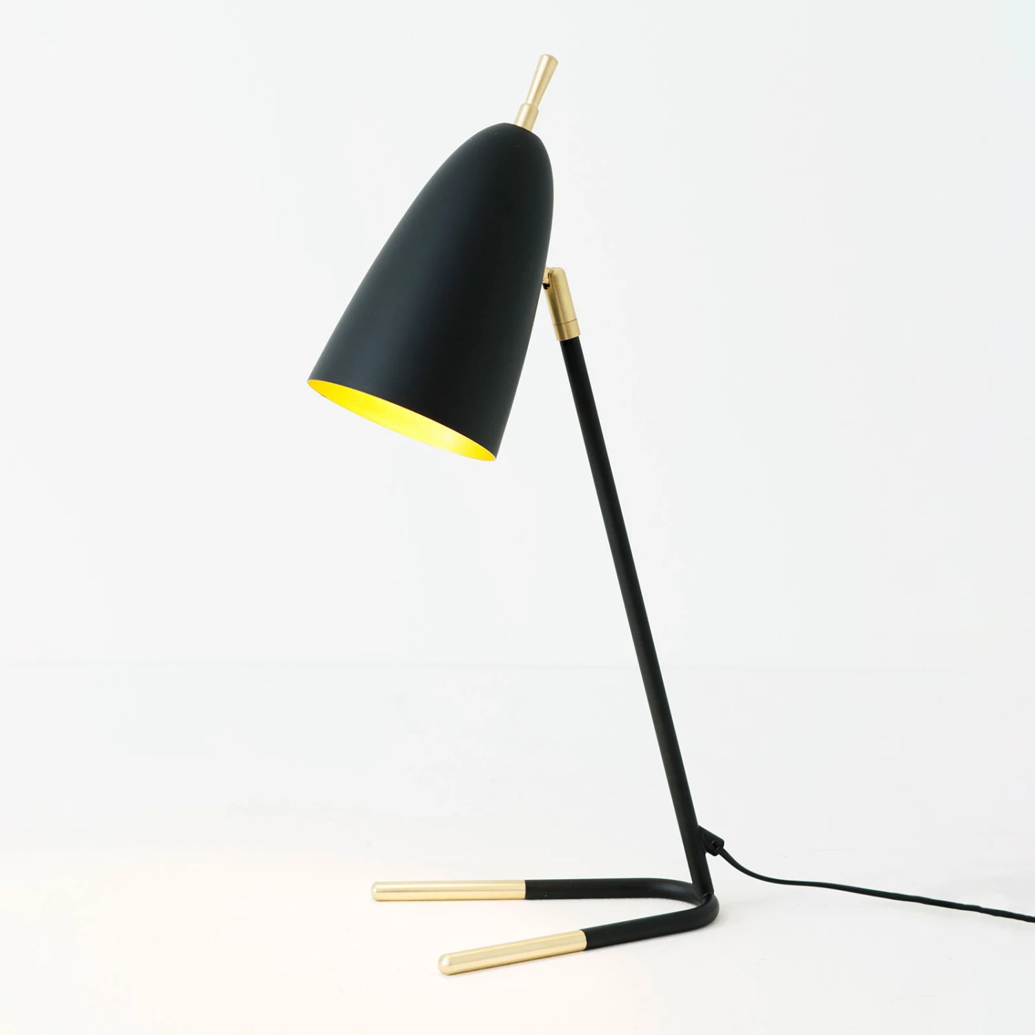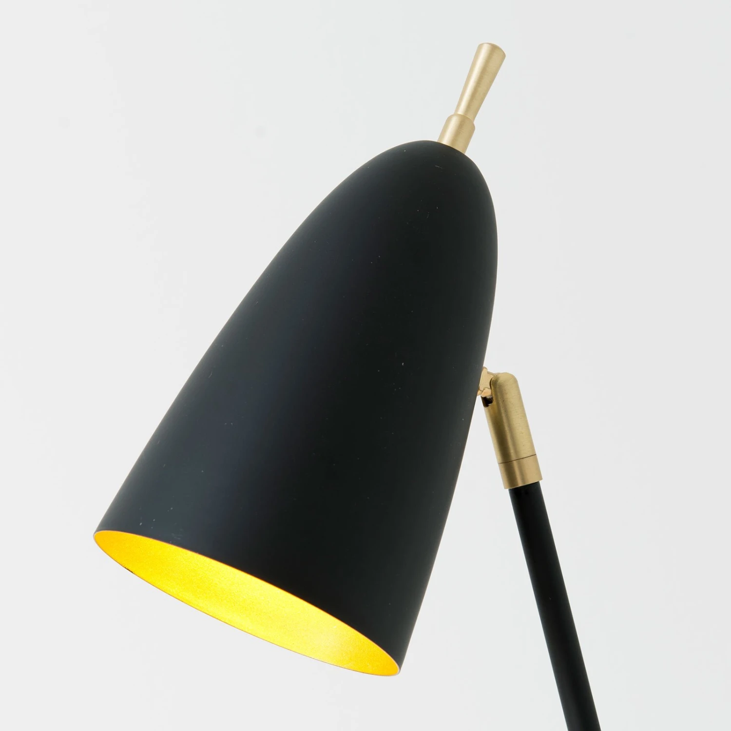 La base en forme de V est en noir et or et se termine par l’élément de liaison avec le parapluie de la même couleur. L’abat-jour est noir à l’extérieur et doré à l’intérieur, ce qui crée un contraste passionnant. Pour allumer et éteindre la lampe, un grand interrupteur doré est monté sur le dessus de l’abat-jour. Comme la lampe n’est pas couverte, mais que des reflets sont créés dans l’abat-jour, cette lampe de table donne un agréable mélange d’éclairage direct et indirect à la pièce.
