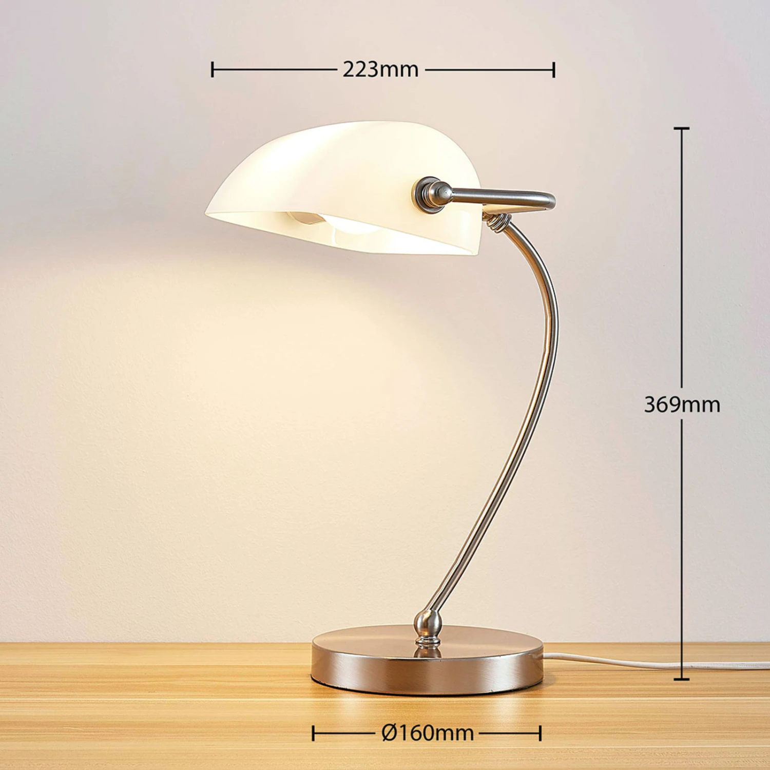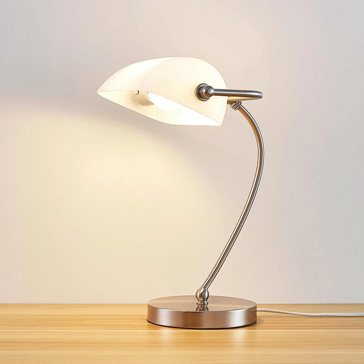 Cette lampe de banquier est une lampe à poser de style classique. Ces lampes à poser ont fait leur apparition dans les premières décennies du 20ème siècle dans les établissements financiers de Wall Street. Ces lampes de banquier jouissent aujourd’hui d’un statut culte et leur popularité n’a jamais reculé parmi les adeptes de luminaires design. Ce modèle issu de la série Selea est lui-aussi porteur de nostalgie, bien qu’avec son verre de lampe blanc opale et son socle de nickel satiné, il dégage une impression un peu moderne.