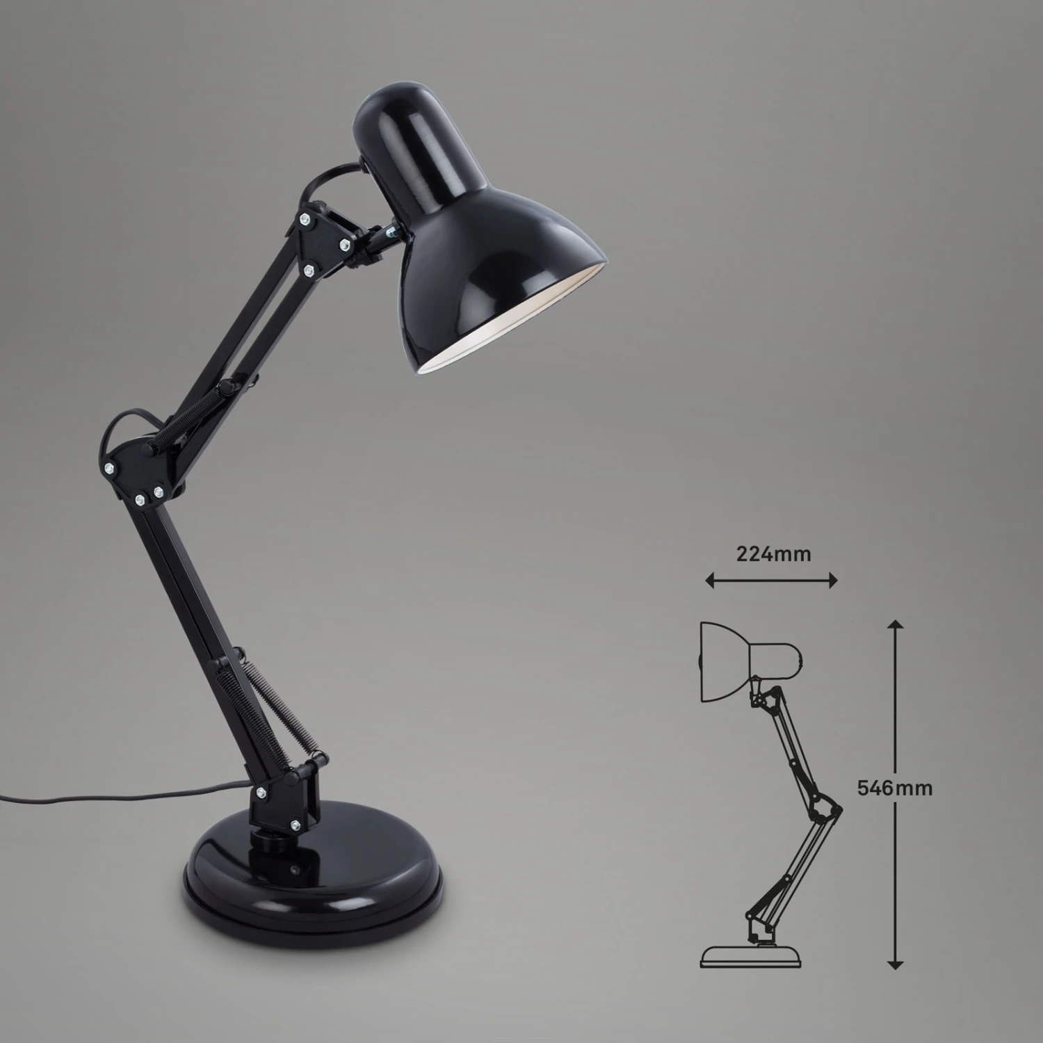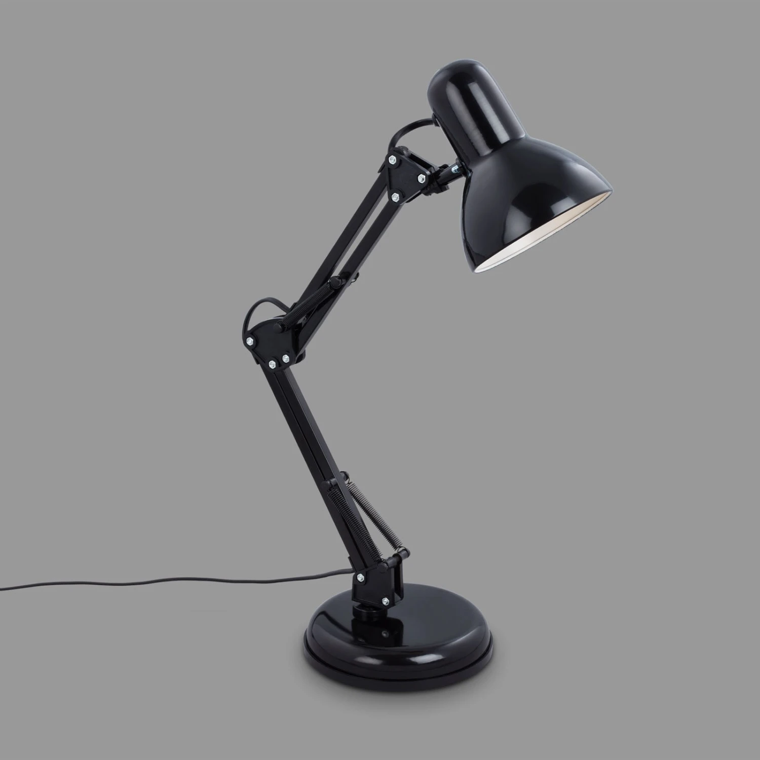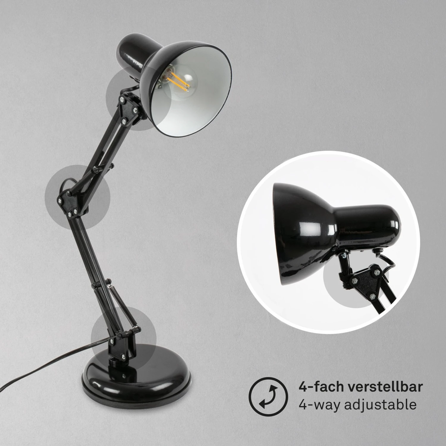 Lampe de bureau ajustable Pixa au design noir rétroLa lampe de bureau Pixa s’inspire du design original des lampes de bureau. Les deux parties de la structure ainsi que l’abat-jour sont orientables, les articulations ouvertes et les mécanismes à ressort servent à l’ajustement et caractérisent l’apparence de Pixa. Sur la lampe de table noire, seul l’intérieur de l’abat-jour est blanc, ce qui favorise une émission de lumière à faible perte. Elle est équipée d’un interrupteur sur le câble de la fiche.