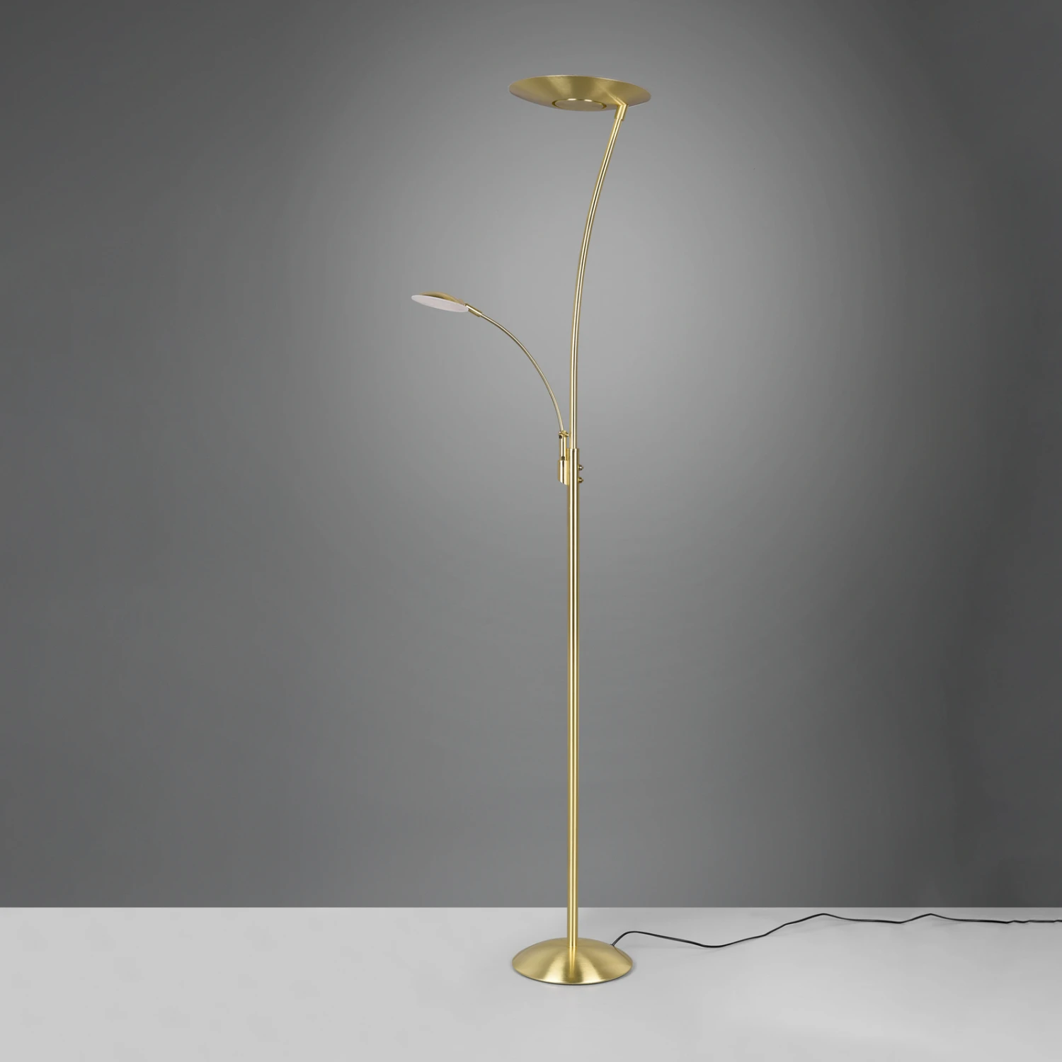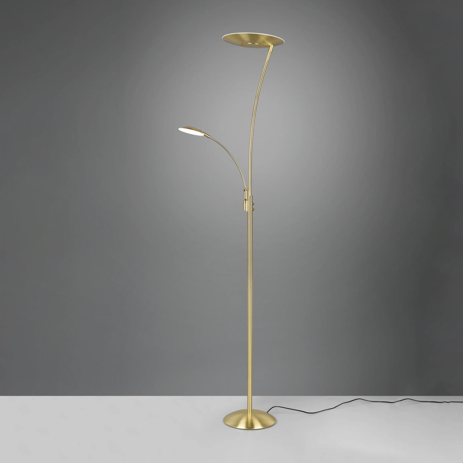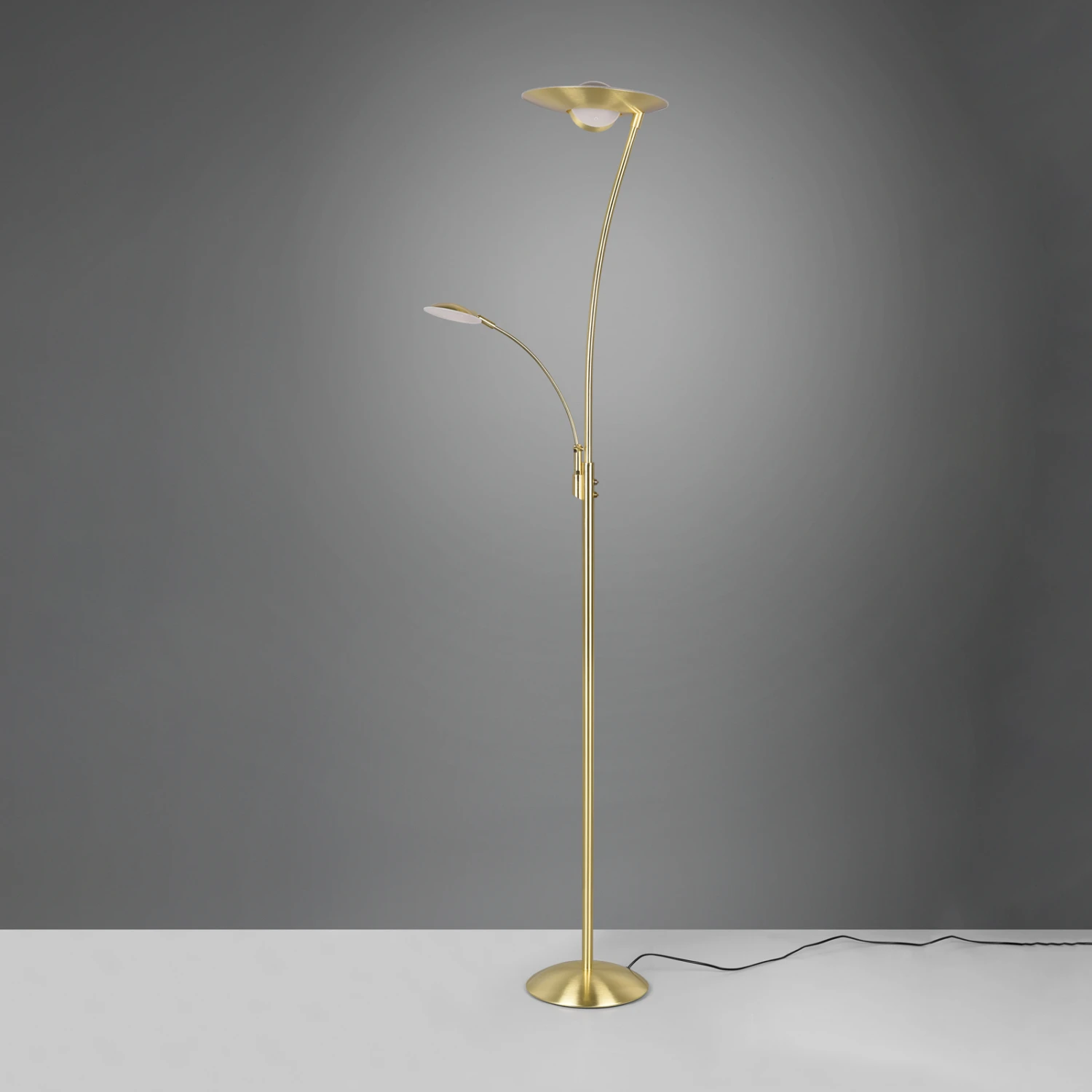 Lampadaire LED Granby confortable avec lampe de lecture LEDUniquement éclairé, le lampadaire LED Granby se distingue par son design élégant et intemporel qui met en valeur chaque intérieur. En ce qui concerne l’éclairage, Granby est multifonctionnel : les deux sources lumineuses peuvent être commutées séparément, trois températures de couleur peuvent être réglées et l’intensité lumineuse peut être modulée en continu. De plus, Granby est équipé d’une fonction de mémoire qui garantit qu’un réglage sélectionné une fois est conservé après le rallumage de l’éclairage.