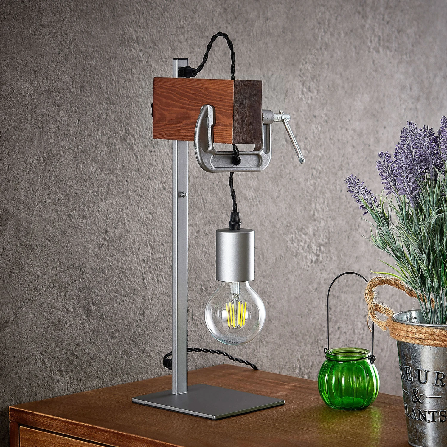 Asja, lampe de table en bois et en fer, avec un aspect de maison de campagne