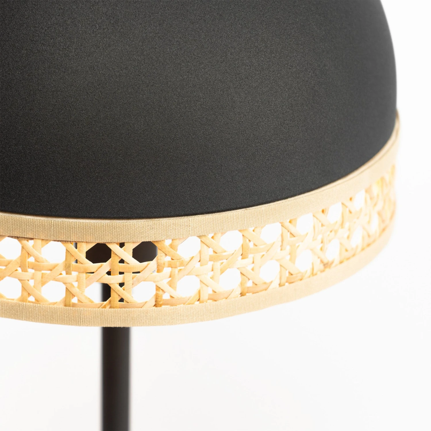 Lampe de table ronde Lonnaris en métal noir avec détails en tressage viennoisLonnaris a un abat-jour en forme de dôme qui laisse échapper sa lumière exclusivement vers le bas, car il est réalisé en métal. Cela permet de générer un éclairage non éblouissant qui est particulièrement bienvenu dans les chambres à coucher, car il semble très confortable. L’abat-jour métallique hémisphérique est noir et se termine à son extrémité inférieure par un ornement en bambou dans le tressage typiquement viennois, ce qui crée une richesse de contraste intéressante et mise sur une tendance générale. La tradition et la modernité s’unissent ici en un design habile qui convainc immédiatement l’observateur par son look stylé.
