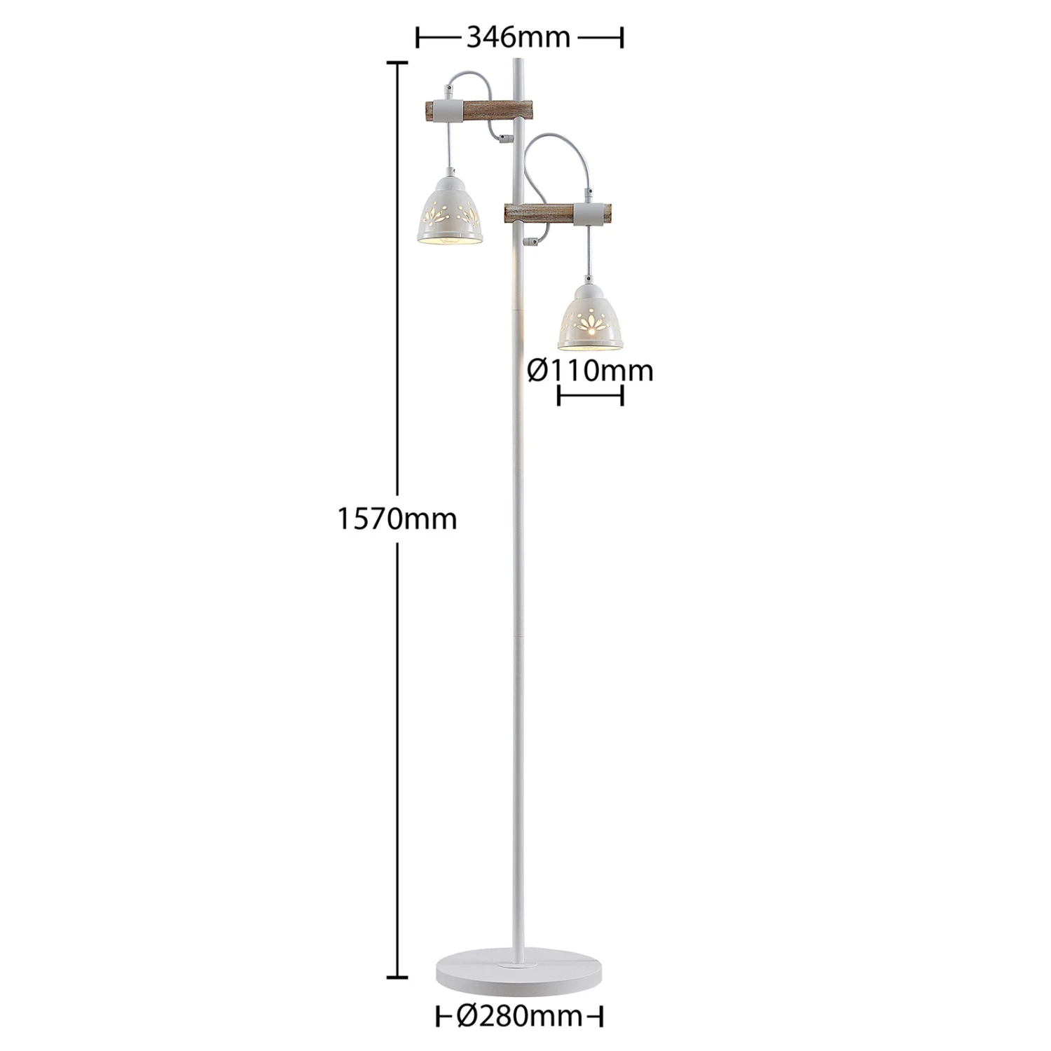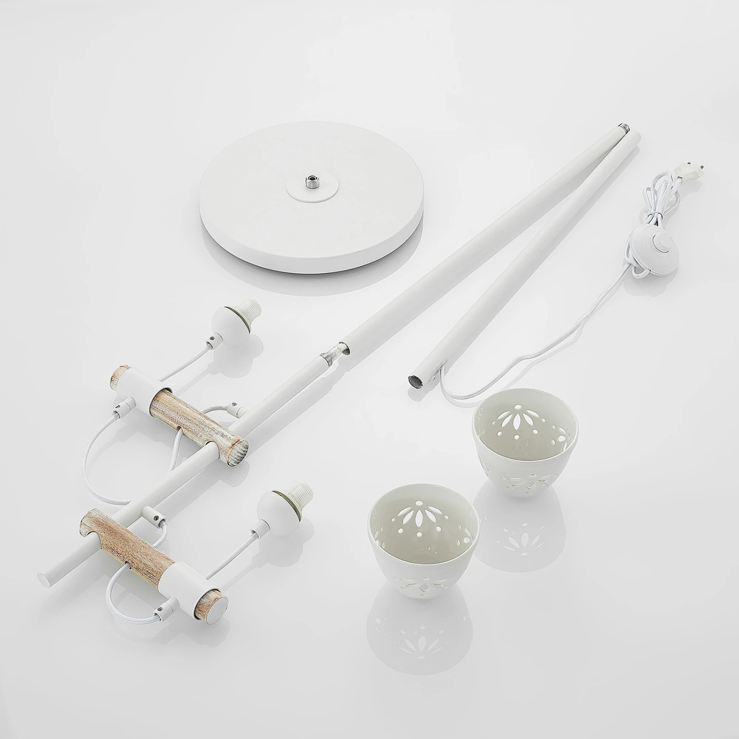 Pimana est un beau lampadaire au design particulier. Il possède un pied de lampe rond en acier qui lui confère la stabilité nécessaire. Deux poutres horizontales, revêtues d’un décor boisé chaleureux, sont fixées à une structure simple. Les deux abat-jour y sont suspendus et diffusent leur lumière de manière ciblée vers le bas. Les abat-jour ont été fabriqués en céramique blanche et possèdent des découpes florales qui créent des accents lumineux intéressants dans la pièce. Ce luminaire apporte confort et élégance dans la pièce à vivre et peut être commandé confortablement à l’aide d’un interrupteur à pied.
