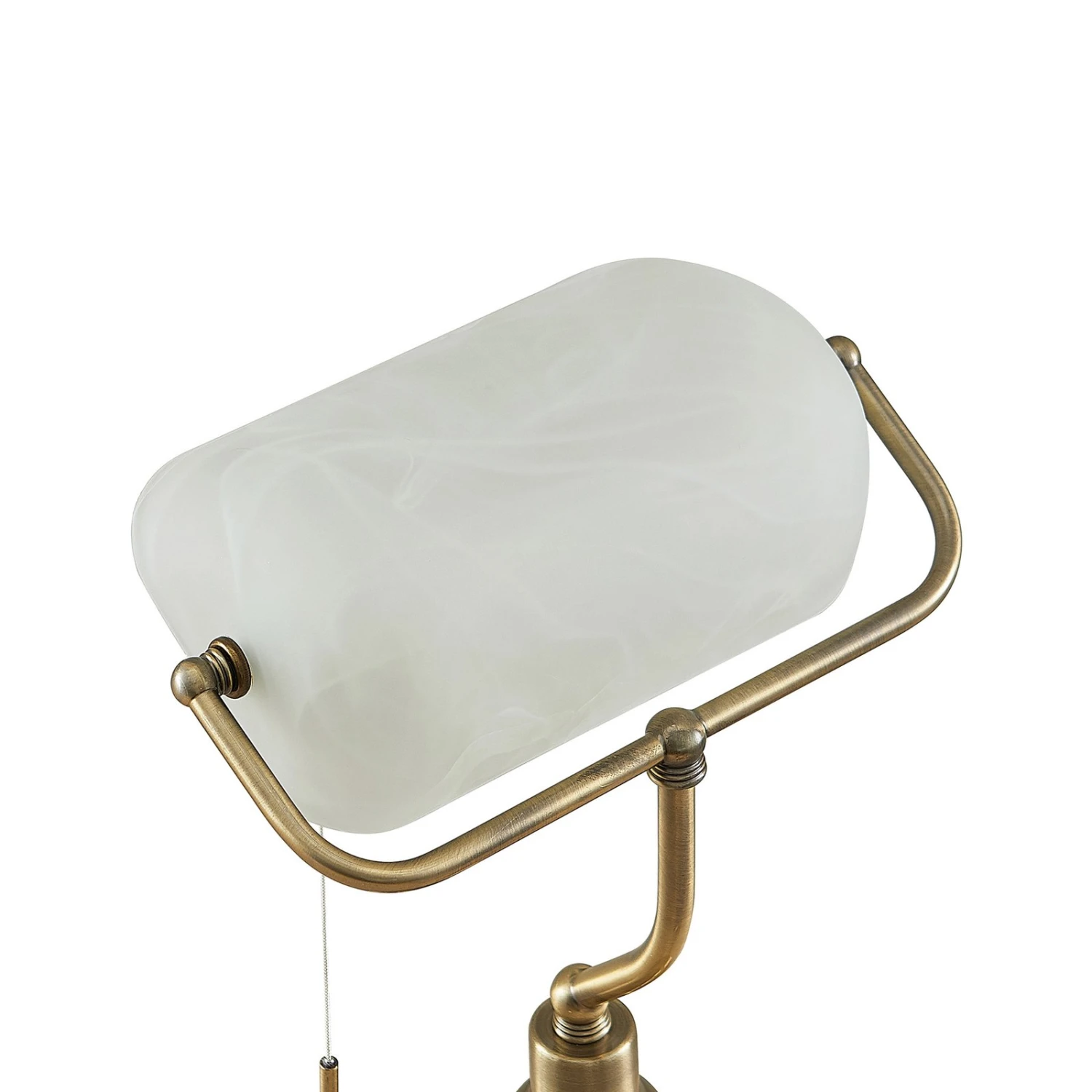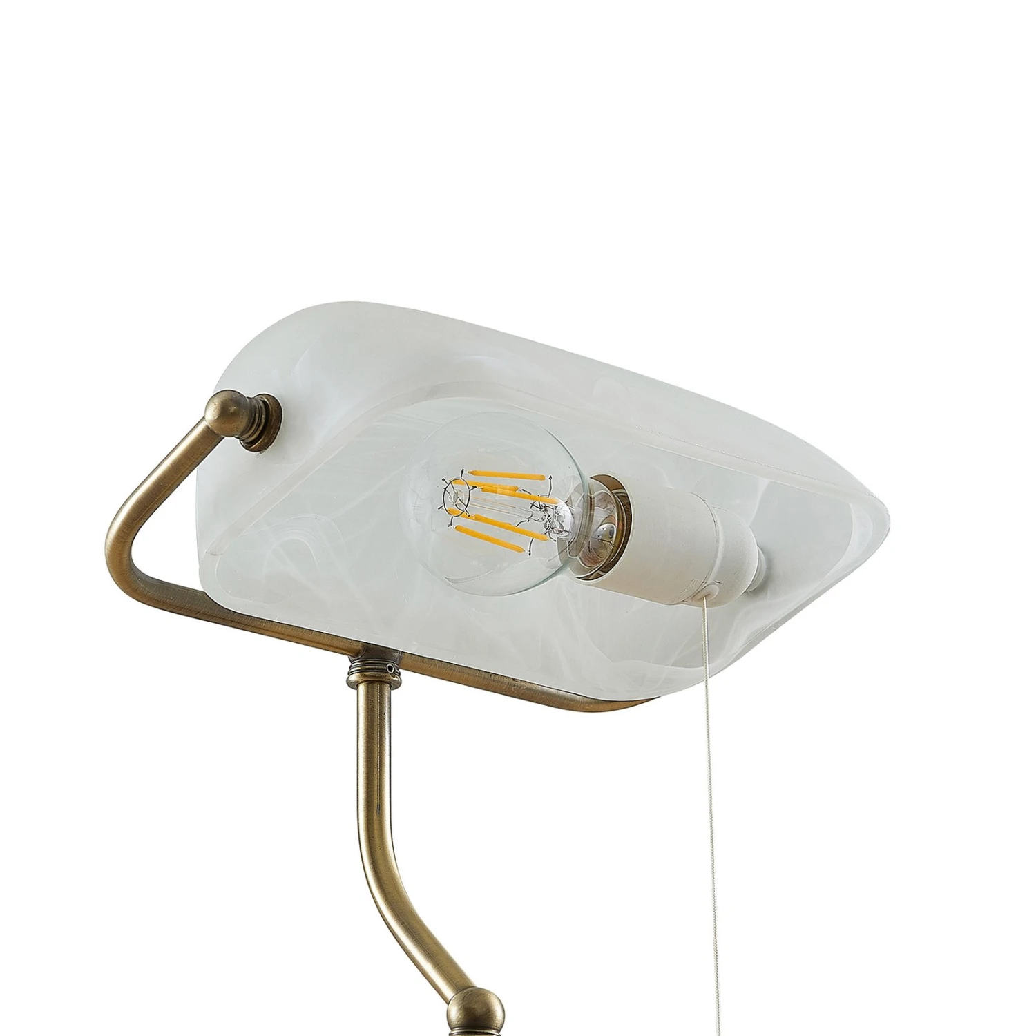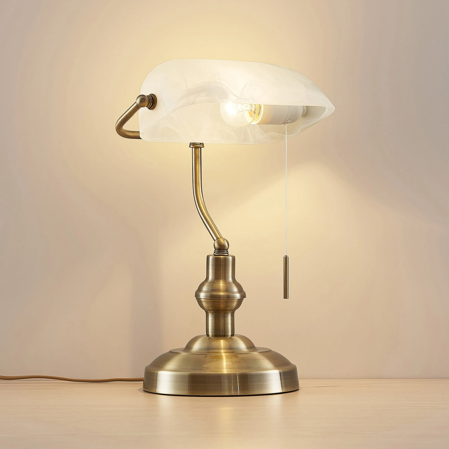 Lampe de bureau de style banquier Profina – source de lumière optimale pour le poste de travailLa lampe de bureau Profina a été conçue comme une lampe de banquier classique, dont l’aspect particulier est à la fois nostalgique et stylé. La lampe de banquier trouve son origine au début du siècle dernier, où elle était surtout présente dans les banques, les bibliothèques et les cabinets d’avocats. Grâce à l’abat-jour incurvé en verre blanc opale, la lumière est principalement diffusée vers le bas, de sorte que la surface de travail à la table est bien éclairée et que l’environnement reste non éblouissant. Un interrupteur à tirette pratique se trouve sur le luminaire, de sorte que l’utilisation reste simple et confortable pour l’utilisateur.