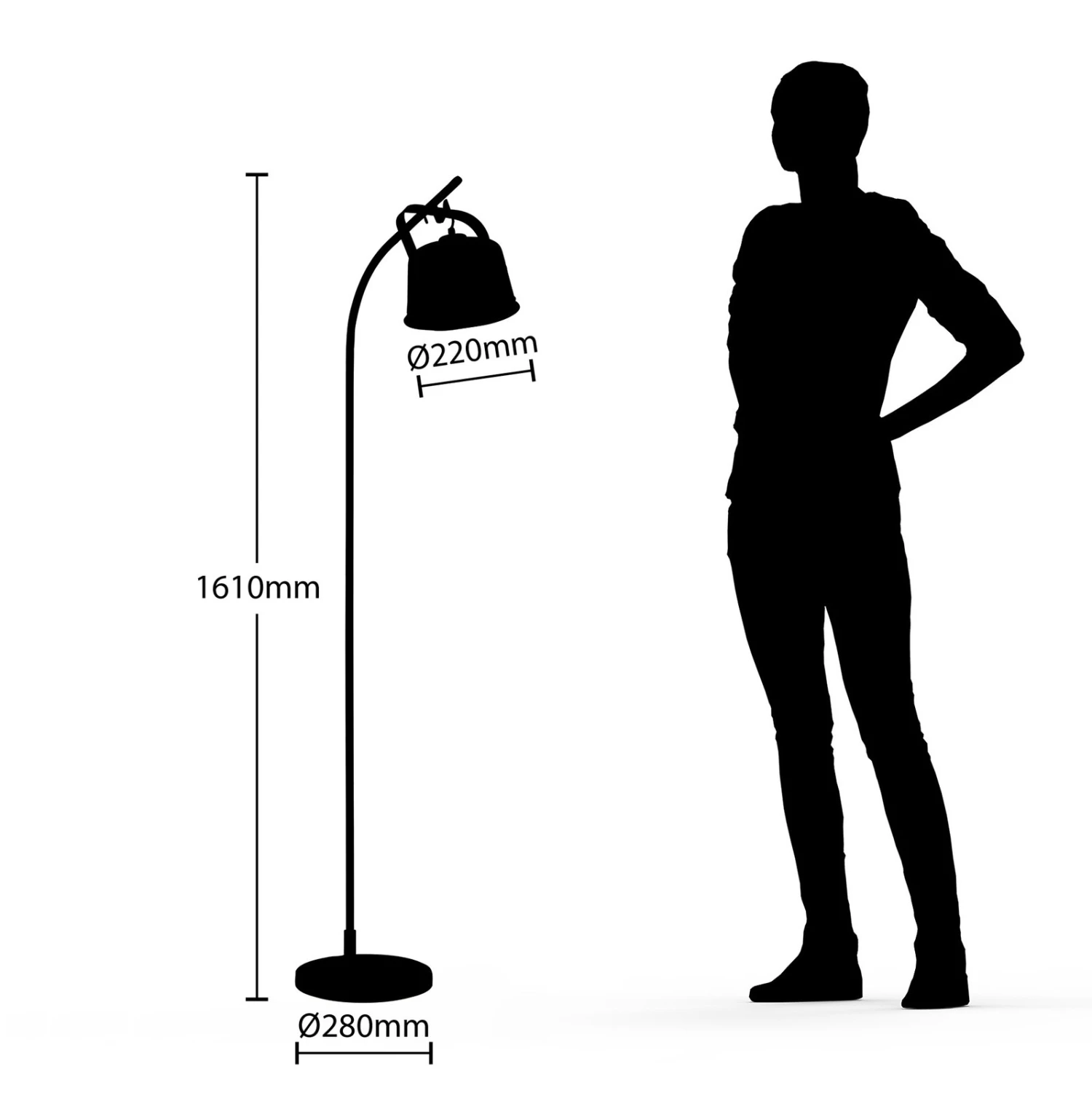 Le cadre métallique du lampadaire Rubinjo dépasse vers le haut de la base ronde en contreplaqué, qui a un aspect flammé, et tient l’abat-jour, également en métal, par son bras incliné. Contrairement au bois de la base, le métal a été peint en noir et l’abat-jour est décoré de petits rivets sur le bord inférieur. Afin de diriger le cône lumineux avec précision, l’abat-jour, y compris le support, peut être tourné et également pivoté dans le support, ce qui fait du lampadaire la lampe de lecture parfaite à côté du fauteuil ou du canapé.