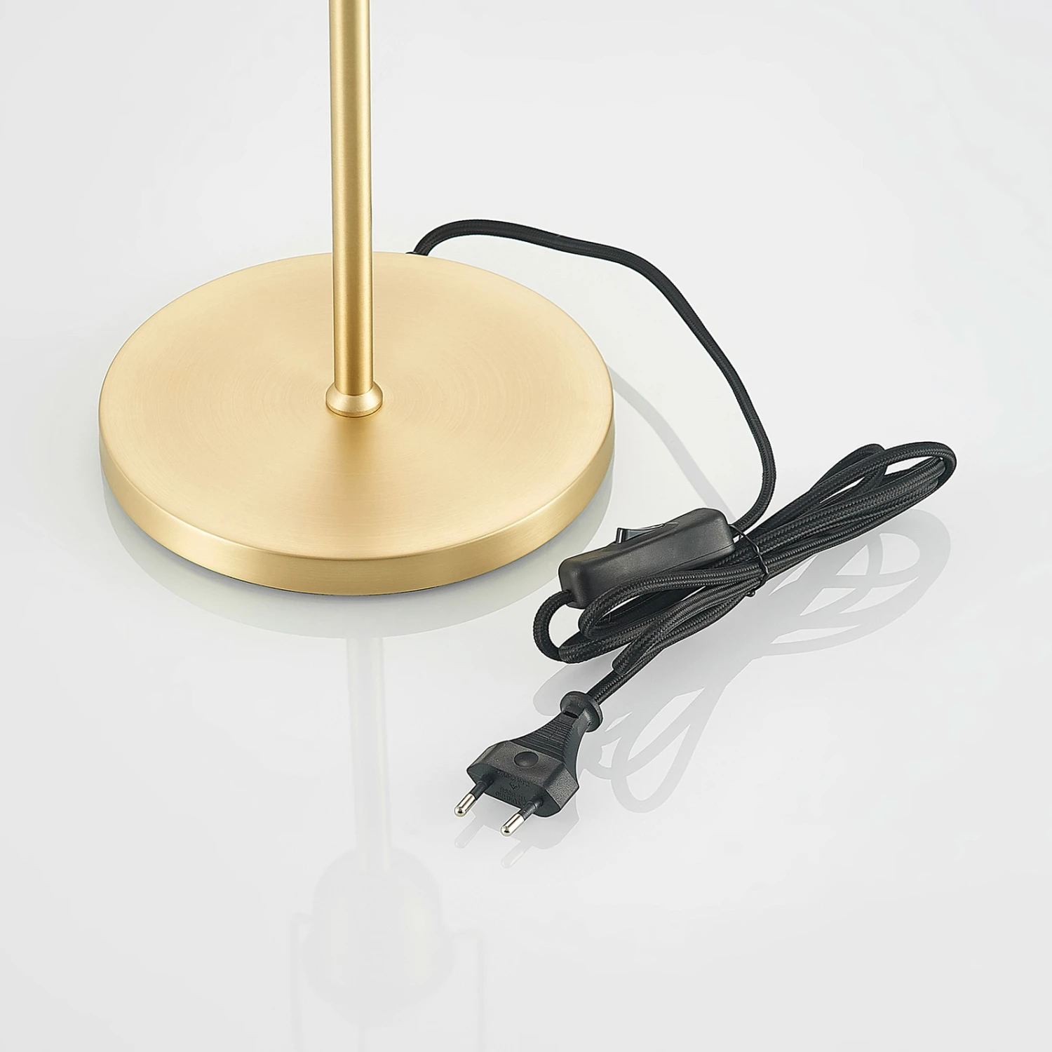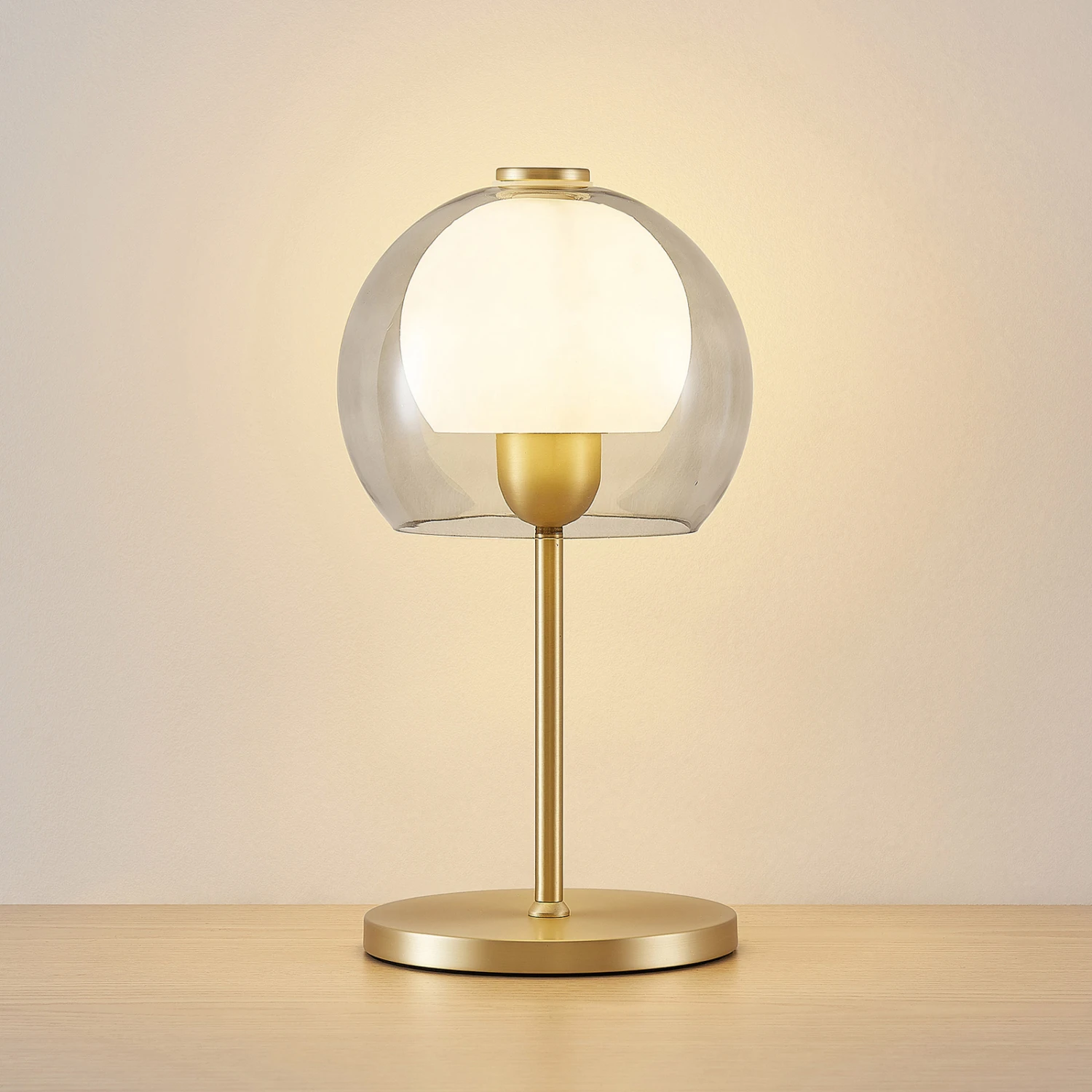 Lampe de table Mylah en fer couleur laiton avec deux abat-jour en verre