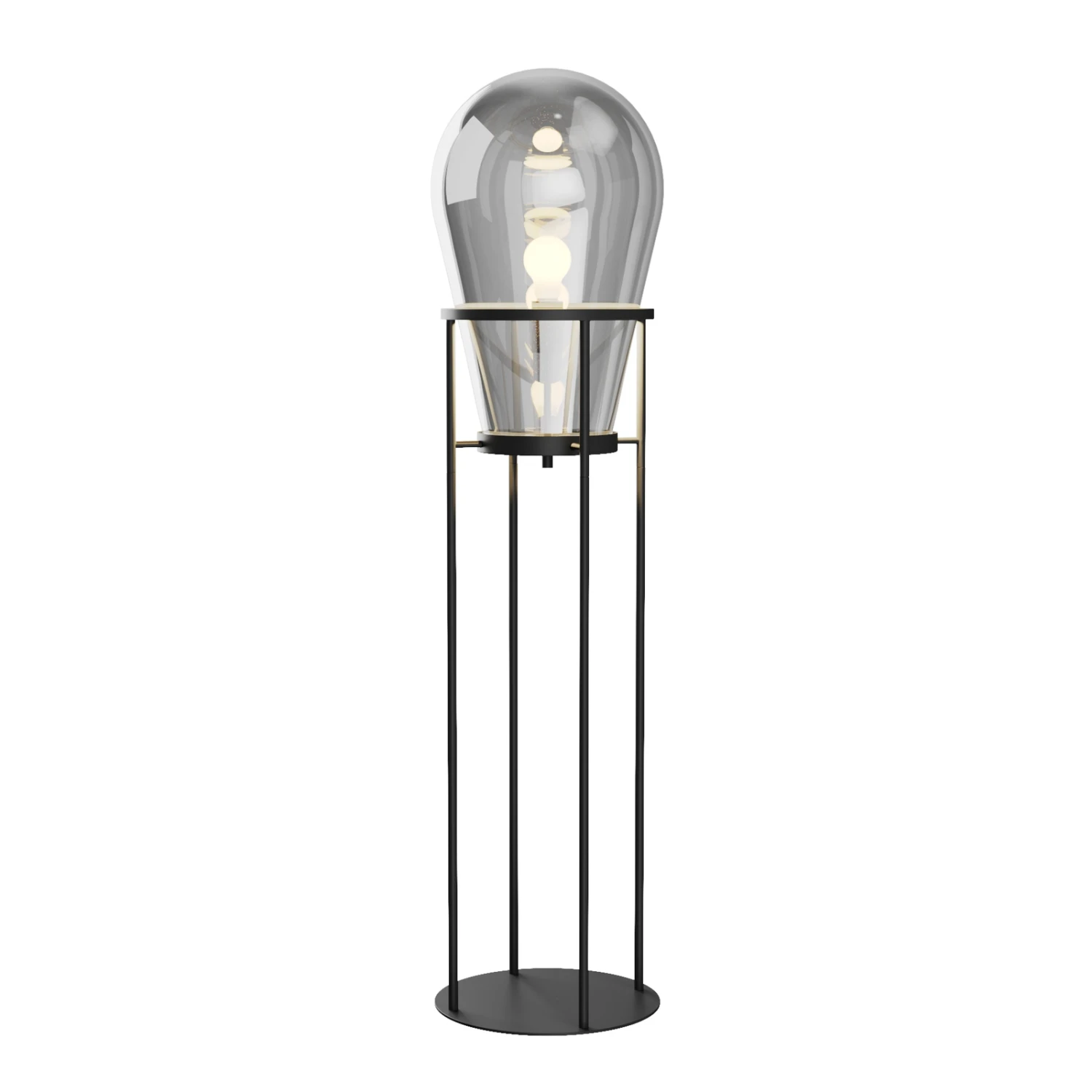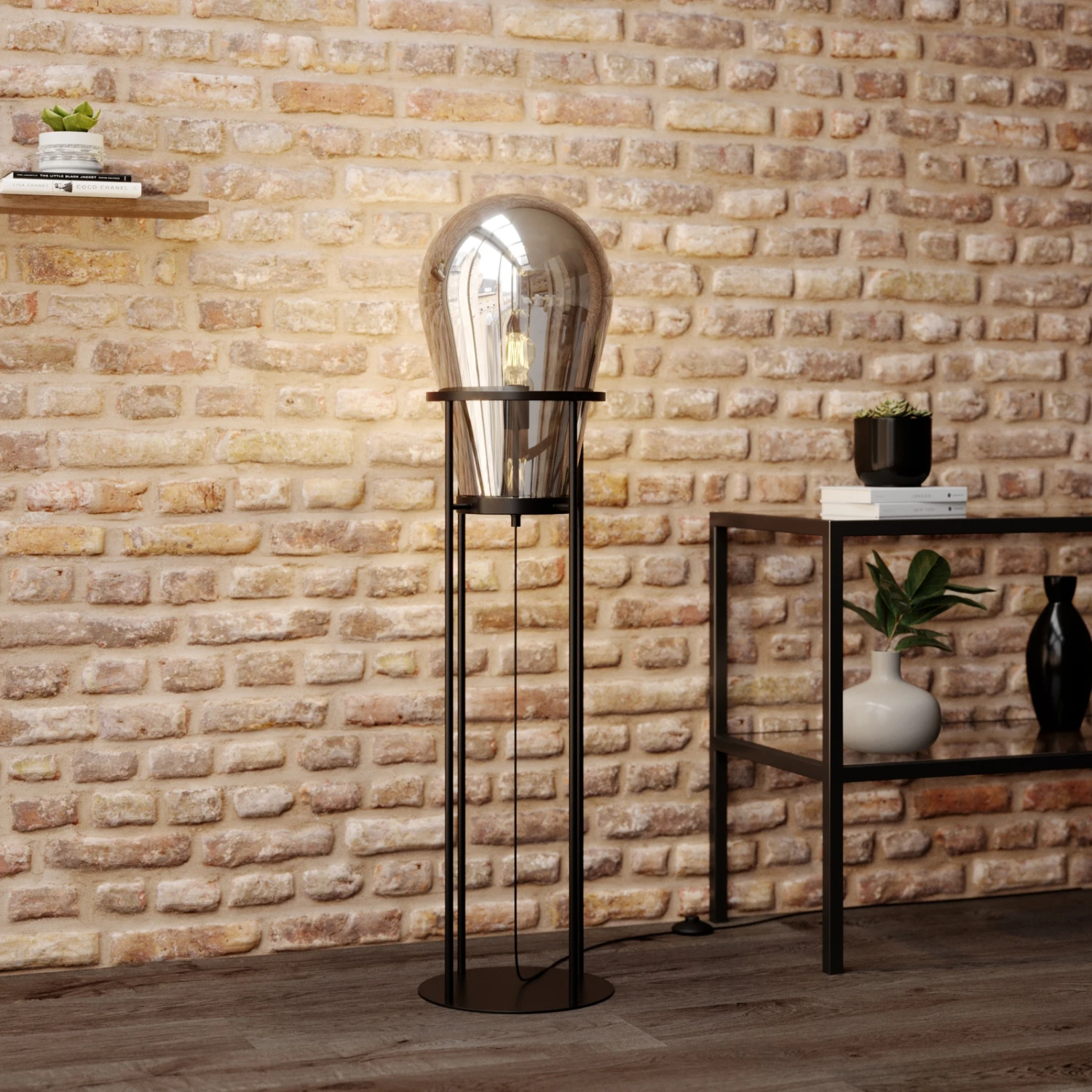 Lampe de sol Viyan noir et gris fumée, un bel objet de vintage au ballon de verre lumineux