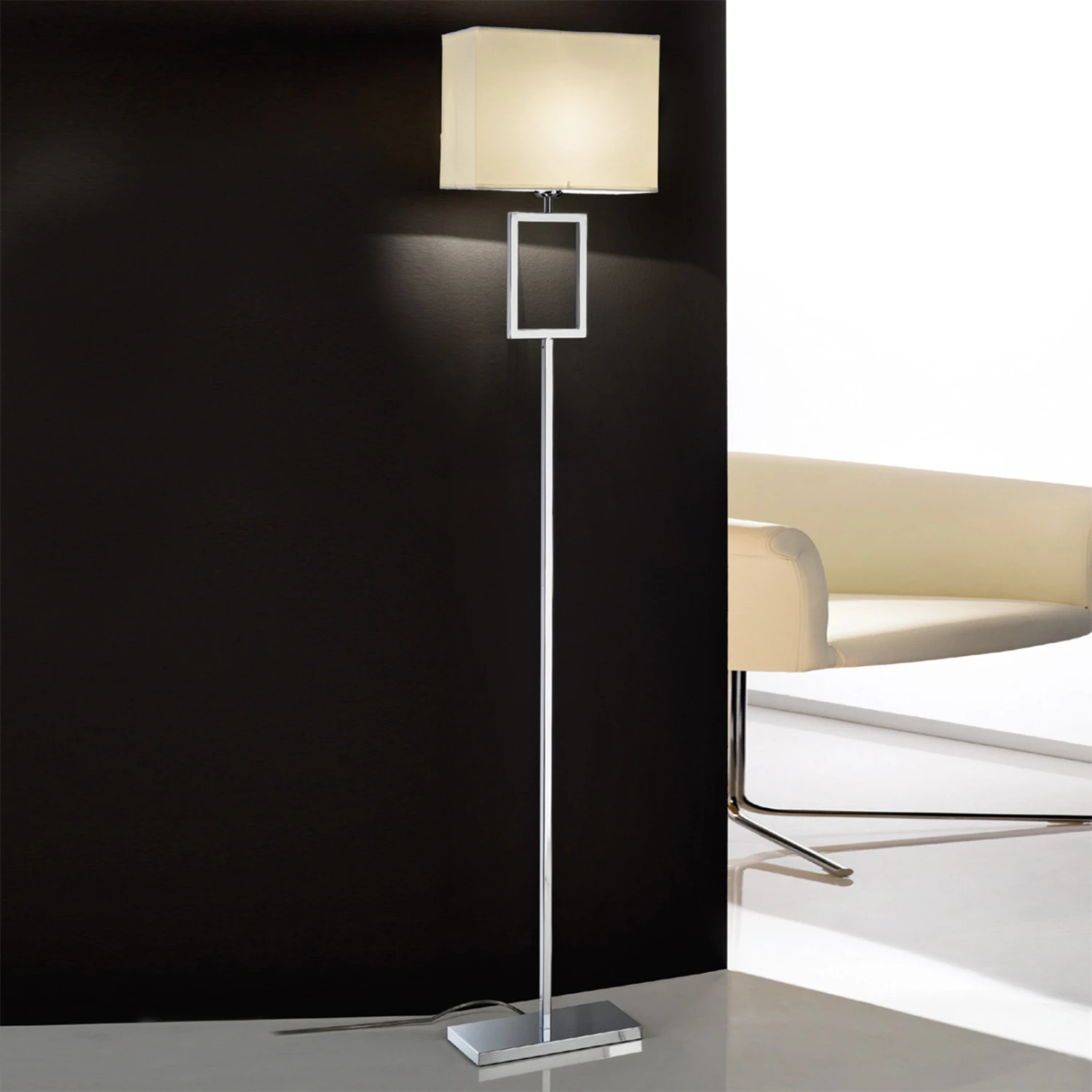 Le lampadaire Renee séduit avec ses formes droites très épurées. Il arbore un magnifique abat-jour de tissu blanc qui laisse échapper une lumière chaleureuse et particulièrement agréable.